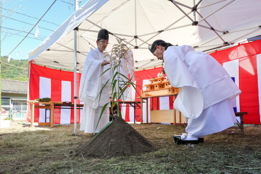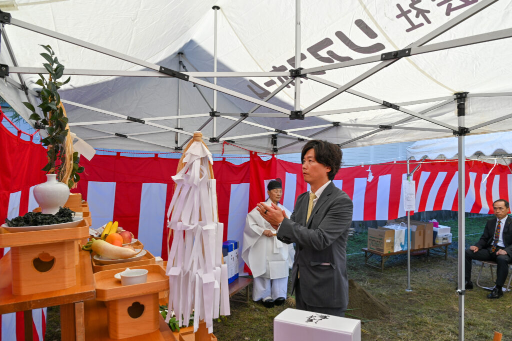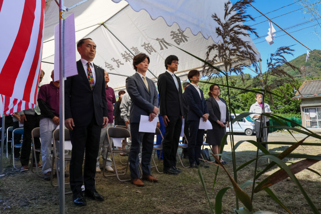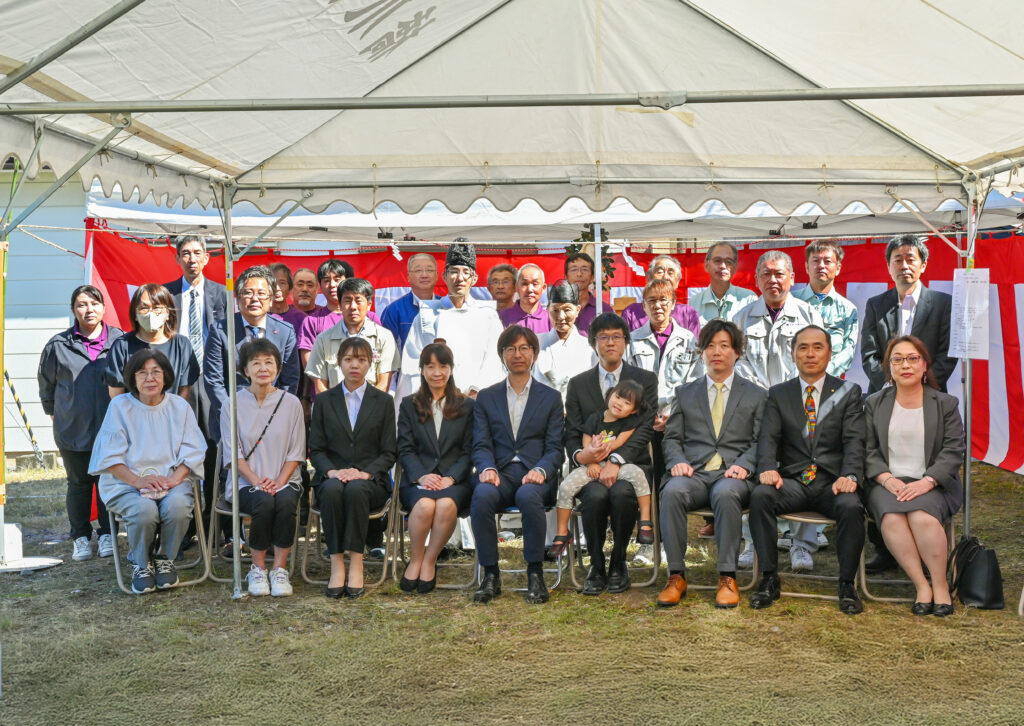 令和7年度社会福祉施設等施設整備費補助事業にて建築するグループホームの起工式を去る9月28日に執り行いました。当日は晴天に恵まれ、遠野八幡宮の宮司さんに祈祷をお願いし、岩手県沿岸広域振興局長並びに釜石市長より祝辞を頂きました。