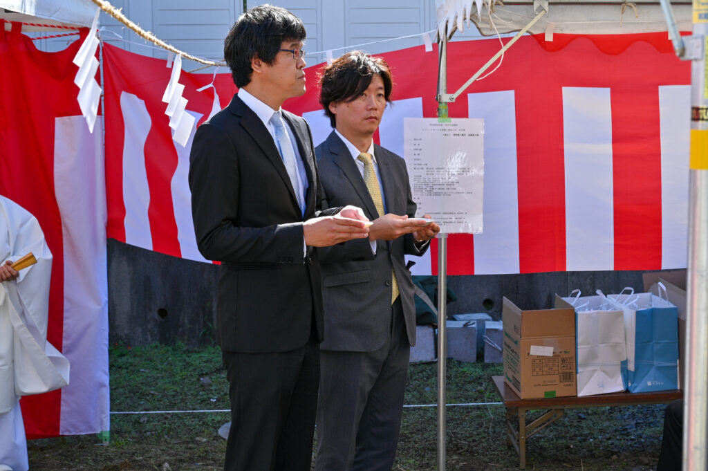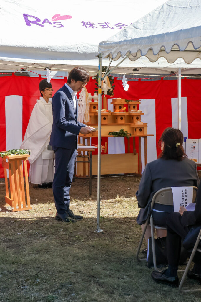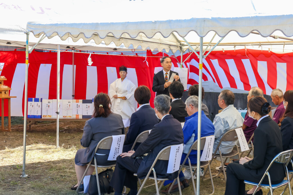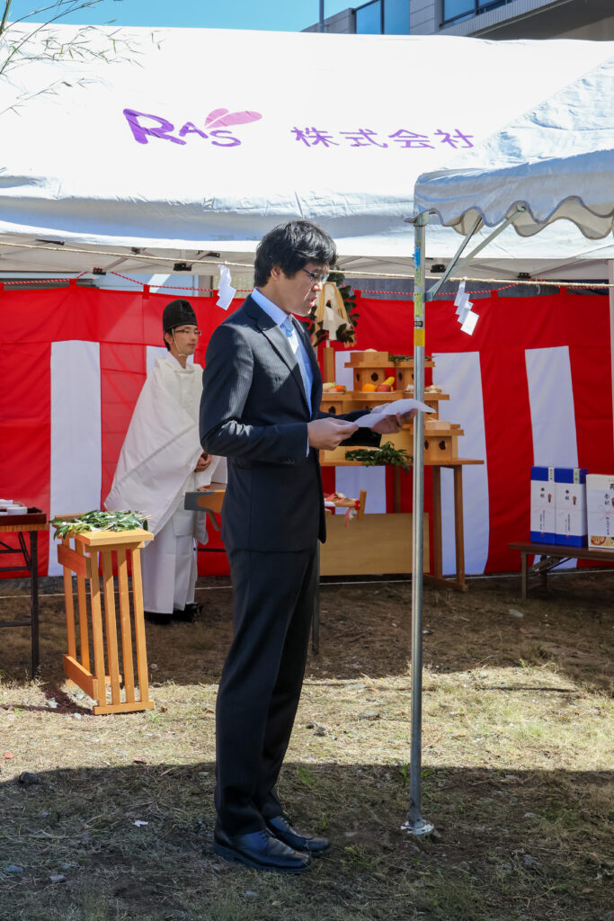 本日ここに、起工式も滞りなくとり行うことができ、いよいよ工事が始まります。ご近隣の皆様には、多大なご迷惑をおかけすることと存じますが、お許し賜りますようお願い申し上げます。最後に、工事が無事に完遂されますことを心からお祈り申し上げまして、私のあいさつといたします。
