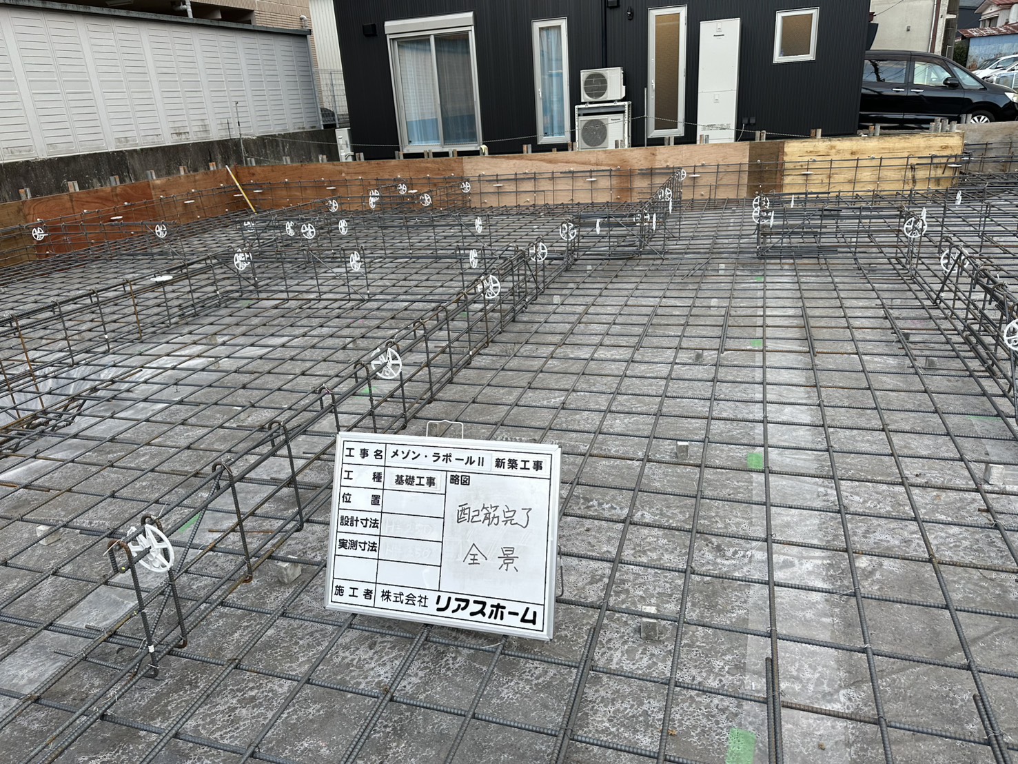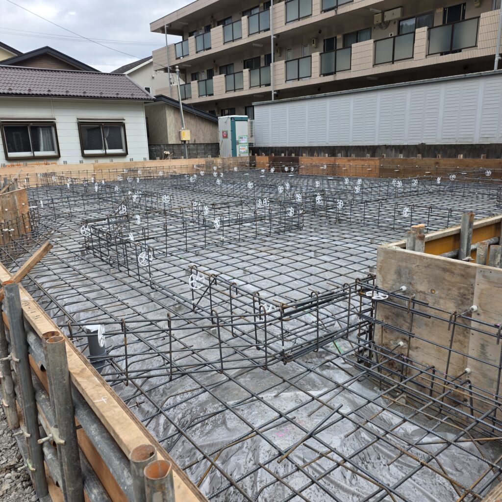 鉄筋により、基礎の形が見えてきました。それに合わせて、1階の間取りもイメージができるように。1回の6部屋、キッチン、リビング、トイレ2か所、脱衣室、バスルーム。広さが分かりますね。